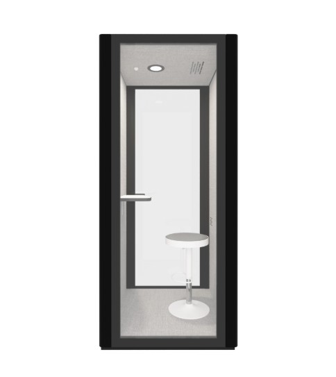 B.Quiet Single Person Acoustic Pod Overall Size: 2245mm H x 1030mm W x 1030mm D Internal Size: 2165mm H x 910mm W x 910mm D Exterior Finish - Black Powder Coat Interior Finish GP18 Dark Grey Eco Panel Desktop Finish: Black Melamine Carpet Finish: Dark Grey 45mm Hidden Frame Glass Door, 10mm Safety Glass To Rear & 6mm Safety Glass To Door Finished With Black Silkscreen Print - Black P/C German Door Ware - 3 x Heavy Duty Stainless Steel Hinges Speech Level Reduction: 30DB Wall Mounted Table: 600mm W x 300mm D ( 2 x 50mm Radius Corners ) D x 25mm T Doorway Width: 840mm Acoustic Pod is Fitted With 1 x LED Light 4w 4000k - 2 x Ventilation Fan Which Are Controlled By A Door Triggered Sensor Power Point: Hager Allure WBHP2SUSBAC-MB - 10Amp Double Internal Power Point With USB A+C Charger - Matte Black Bottom Of The Pod Has Been Fitted With Heavy Duty Castors For Easy Of Movement When Relocating