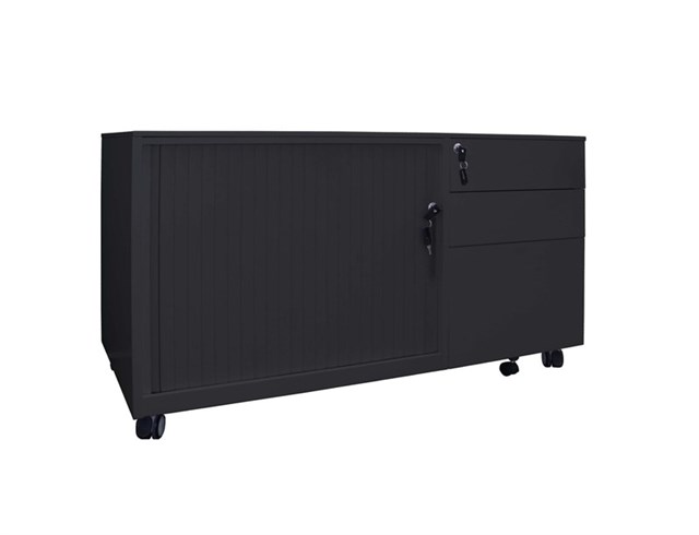 • The Mobile Caddy unit is fully lockable and has a flush front mobile pedestal, and Tambour door section with centre shelf