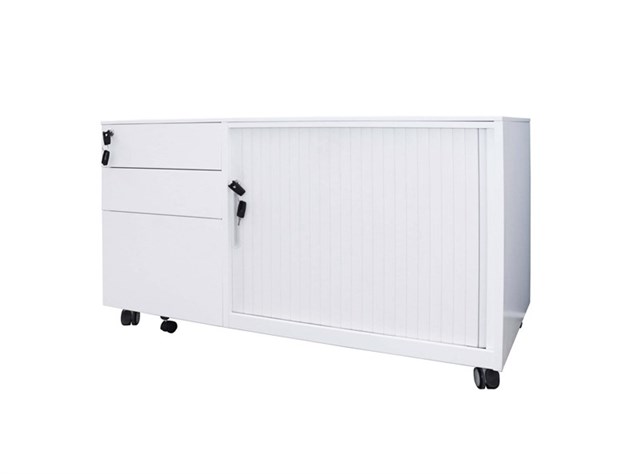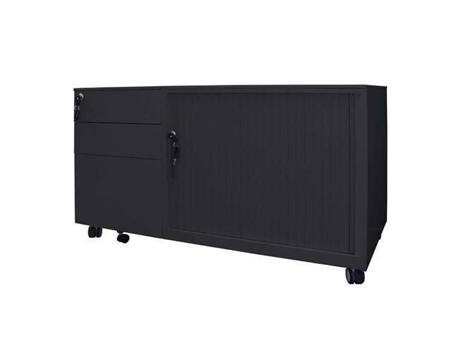 • The Mobile Caddy unit is fully lockable and has a flush front mobile pedestal, and Tambour door section with centre shelf
